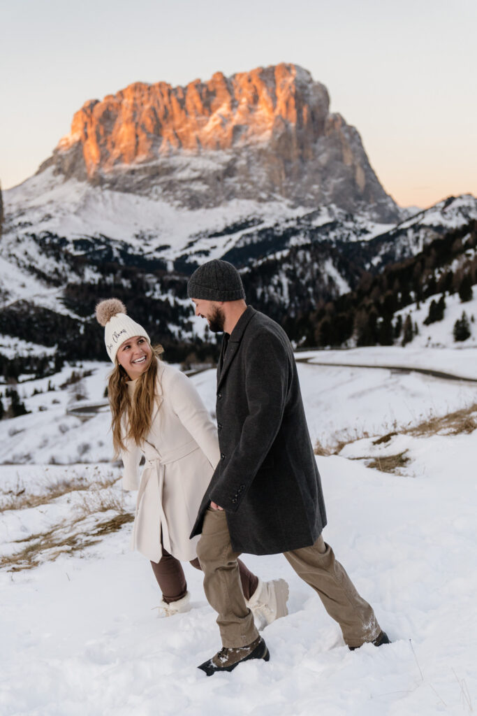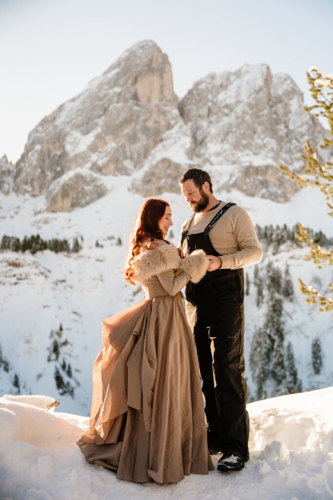 Snowy winter proposals in the Dolomites are especially cozy and playful. Every footstep becomes a canvas, each moment a stage for play. Sound is muffled under fresh snow, and the alpine chill draws you close together. Hands tucked into pockets, arms wrapped tight, warmth shared between breaths–that physical closeness becomes part of the story, reflected in images that feel tender and spontaneous.