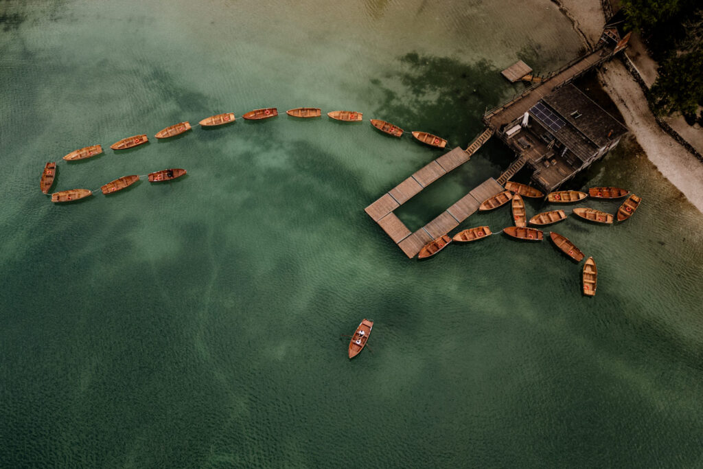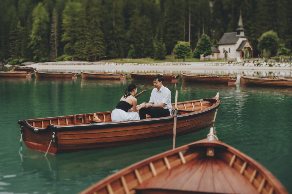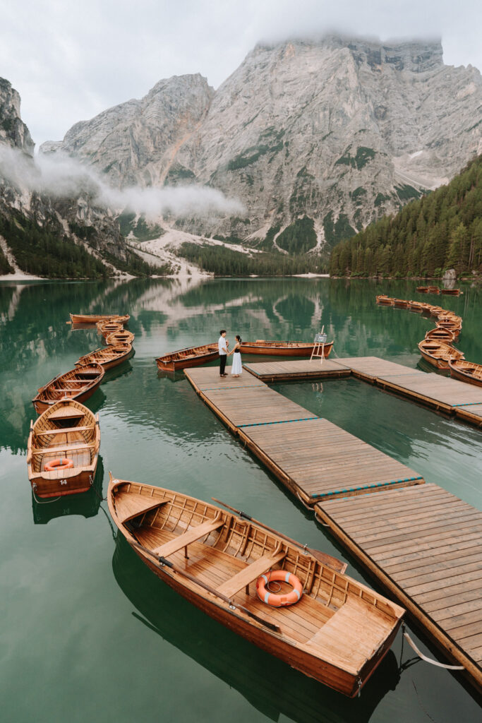 A sunrise boathouse proposal in the Dolomites is serene, romantic, and accessible to all. This options is maybe one of the most popular Dolomites proposal ideas. Thoughtfully placed florals or curated design elements add a a unique editorial touch without overpowering the natural setting. As the day begins around you, the moment feels private and timeless. It’s perfect for couples drawn to subtle luxury and refined, story-driven experiences.